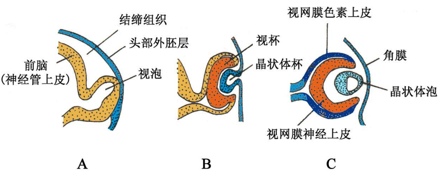 下图展示了眼球发育过程中的多级诱导作用(A.初级诱导 B.次级诱导 C.三级诱导):