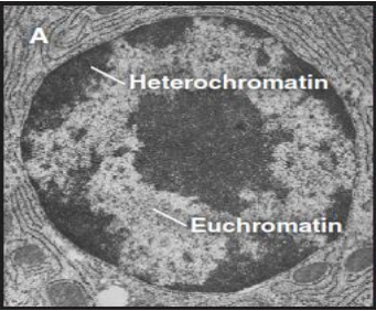 - 异染色质 (heterochromatin):着色深,靠近于核膜,其螺旋化程度高,基本上不进行转录的功能。