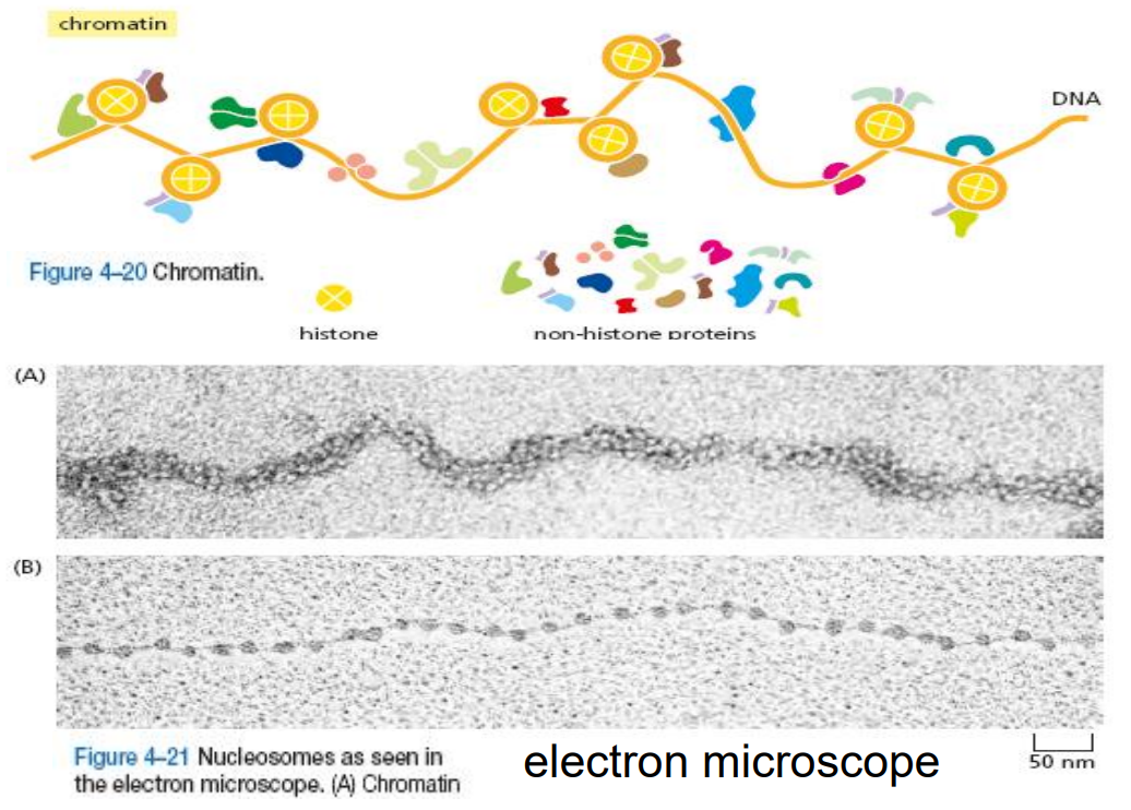 - 一级结构:核小体 (nucleosome),压缩7倍