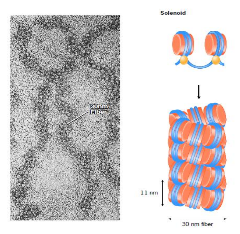 螺线管是由核小体包装后的染色质形成的螺旋结构,为左手螺旋,每圈6个核小体,螺距11nm,外径30nm,内径10nm。