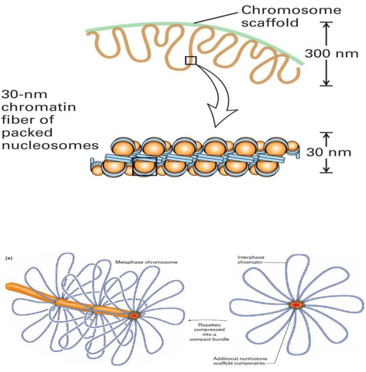 进一步的包装将使得染色质进一步浓缩为染色体,形成支架-放射环模型。非组蛋白构成的染色体骨架 (chromsomal scaffold) 和由骨架伸出的无数的DNA侧环。30nm的染色线折叠成环,沿染色体纵轴,由中央向四周伸出,构成放射环。