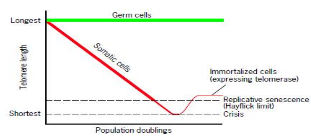 体细胞端粒长度随细胞分裂而变短,当端粒长度缩短到一定程度时,细胞就会死亡。生殖细胞和肿瘤细胞表达端粒酶,维持端粒长度。