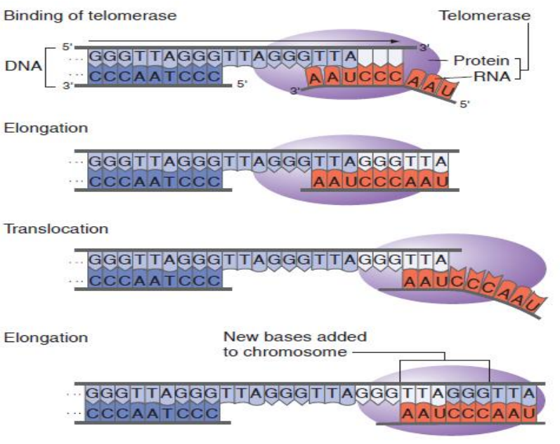 端粒酶由一个具有催化作用的蛋白质和一个与端粒DNA互补的RNA (159 bp) 组成的复合物。端粒酶以自身RNA为模板合成端粒DNA,补充端粒。