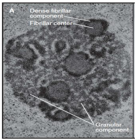 - 致密纤维 (Dense fibrillarcomponent, DFC),新合成的核糖体RNA(rRNA)。