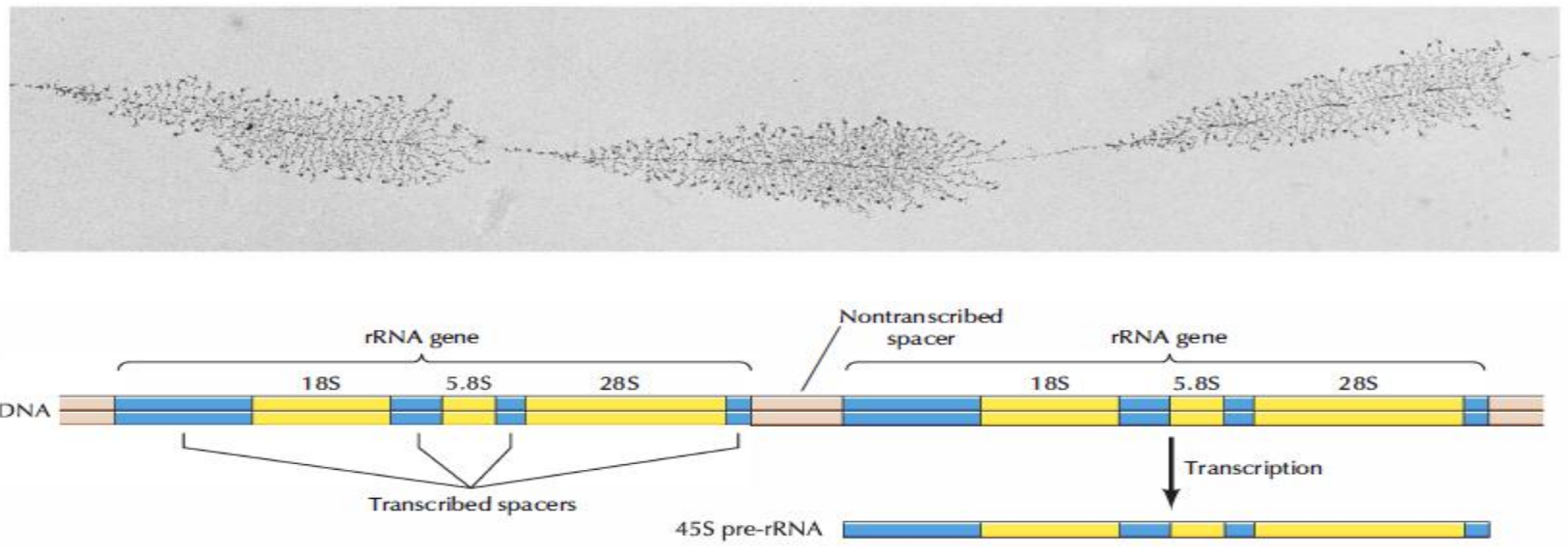 因为细胞内对蛋白质合成的需求是很旺盛的,核糖体自然要足量供应,为了提高合成效率,核仁rRNA的合成过程会形成圣诞树结构,rRNA基因排列及转录形成核糖体RNA前体。