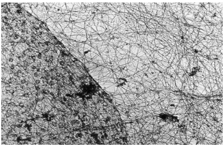 下图通过透射电子显微镜 (Transmission Electron Microscope, TEM)拍摄到核骨架纤维网状结构: