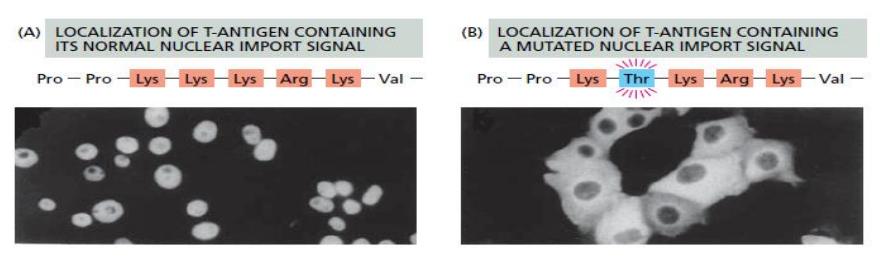 猴肾病毒 (SV40) 的T抗原NLS突变丧失入核能力。