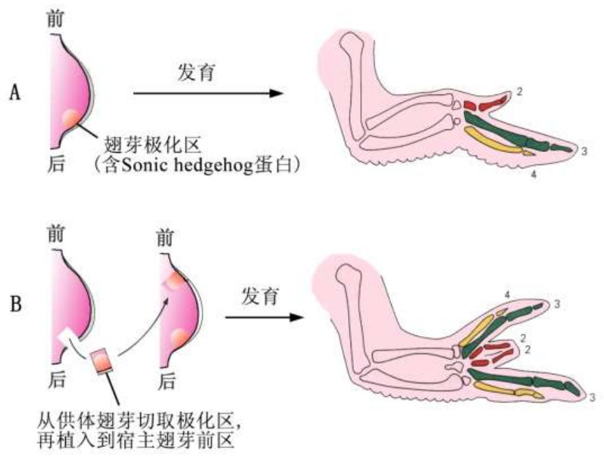 下图展示了位置信息(sonic hedgehog信号)在翅膀发育中的作用: