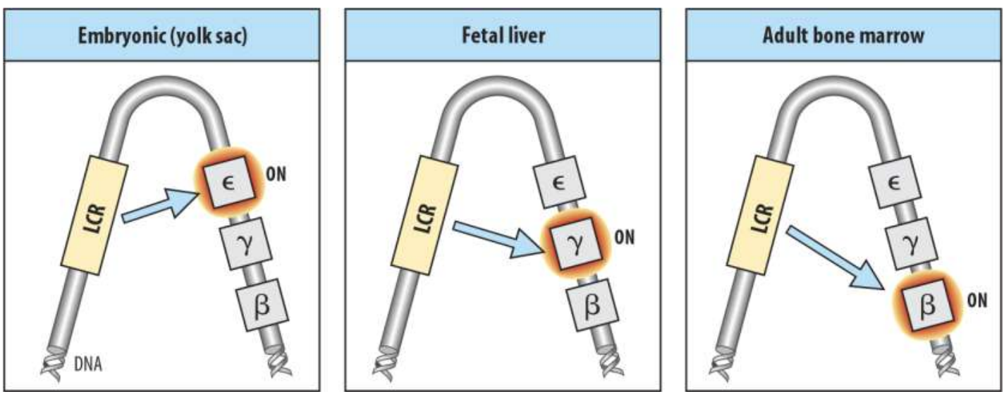 其中一个典型案例就是人体内的血红蛋白珠蛋白,在个体发育过程中依次有不同的β-珠蛋白基因的打开和关闭,这与β-珠蛋白基因簇上游的基因座控制区 (LCR) 有关。