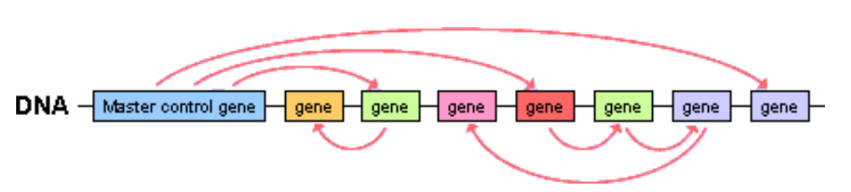 - 空间共线性:身体最前端取用[Hox-1],次前端取用[Hox-2]...以此类推到最后端取用[Hox-n]作为他们的指导发育的基因。