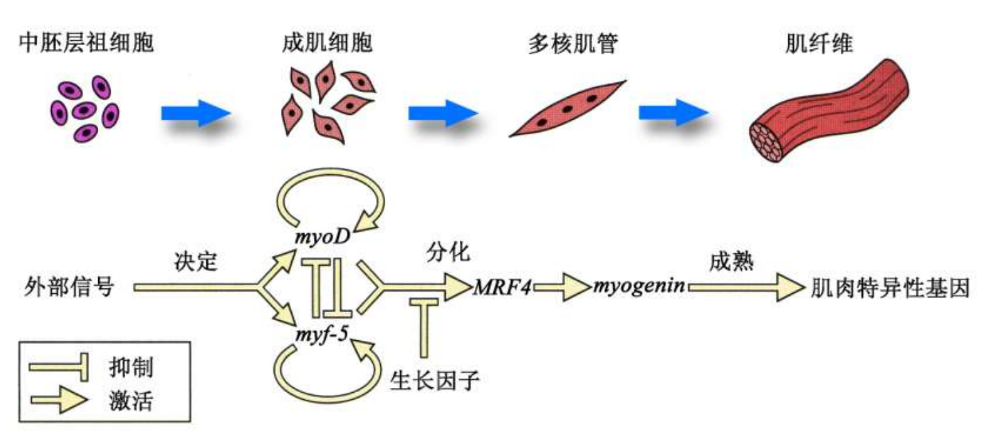 典型例子是哺乳动物成肌细胞向肌细胞分化的过程中,myoD基因起到了重要作用。