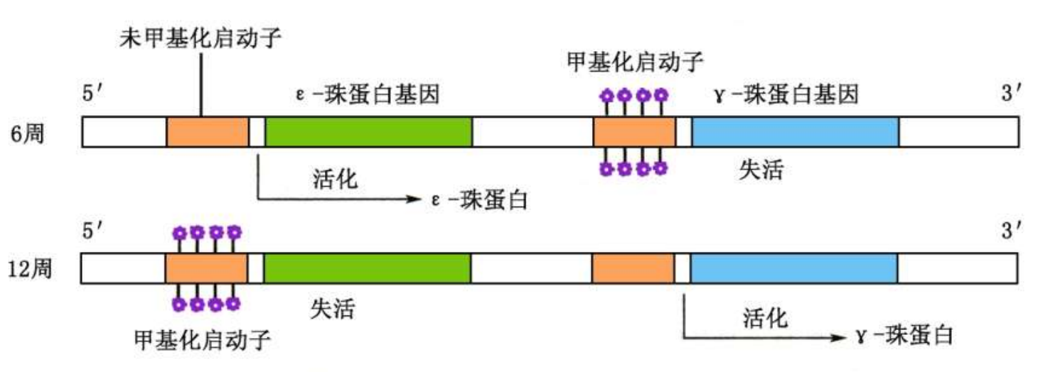 下图展示了人类胚胎红细胞中珠蛋白基因的甲基化: