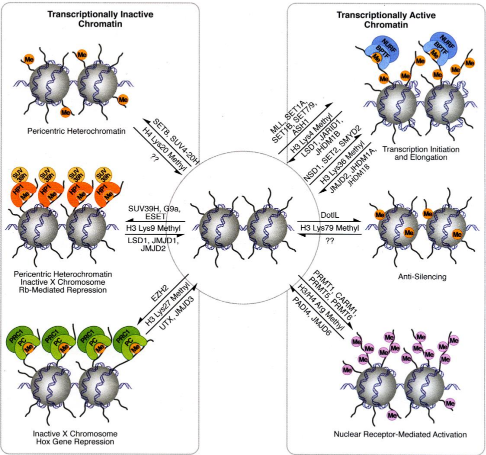 组蛋白中被修饰氨基酸的种类、位置和修饰类型是丰富多样的,其中任意组合被称为组蛋白密码 (histone code),它决定了染色质转录活跃或沉默的状态。
