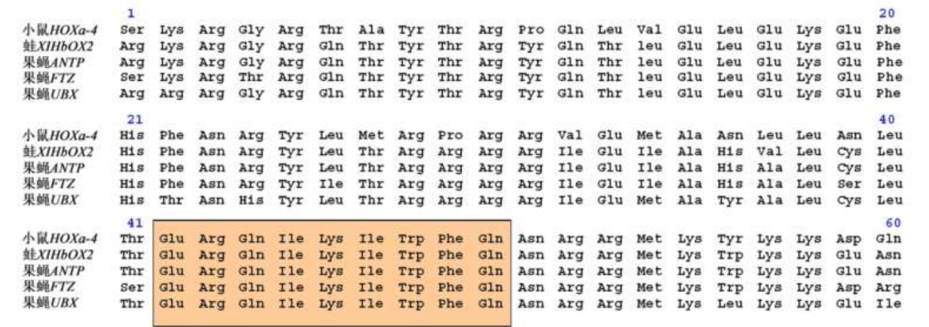 下图展示了不同生物同源异形框编码的氨基酸序列对比: