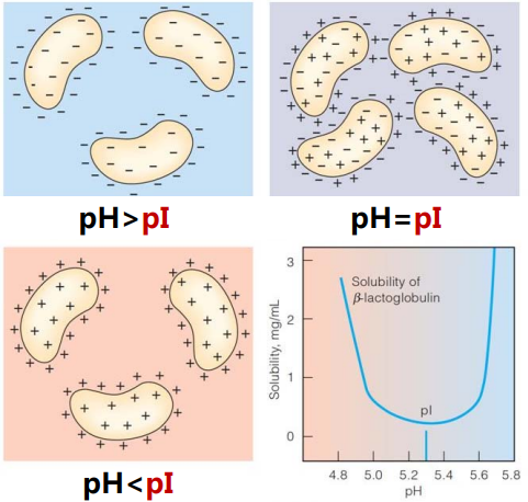 - pH=pI时候,蛋白质表面净电荷为0,溶解度最小。