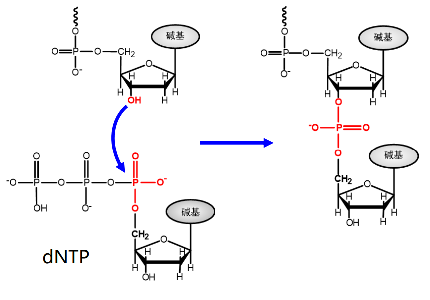 核苷酸之间再次酯化,形成3'-5'磷酸二酯键,相互连接形成DNA/RNA。