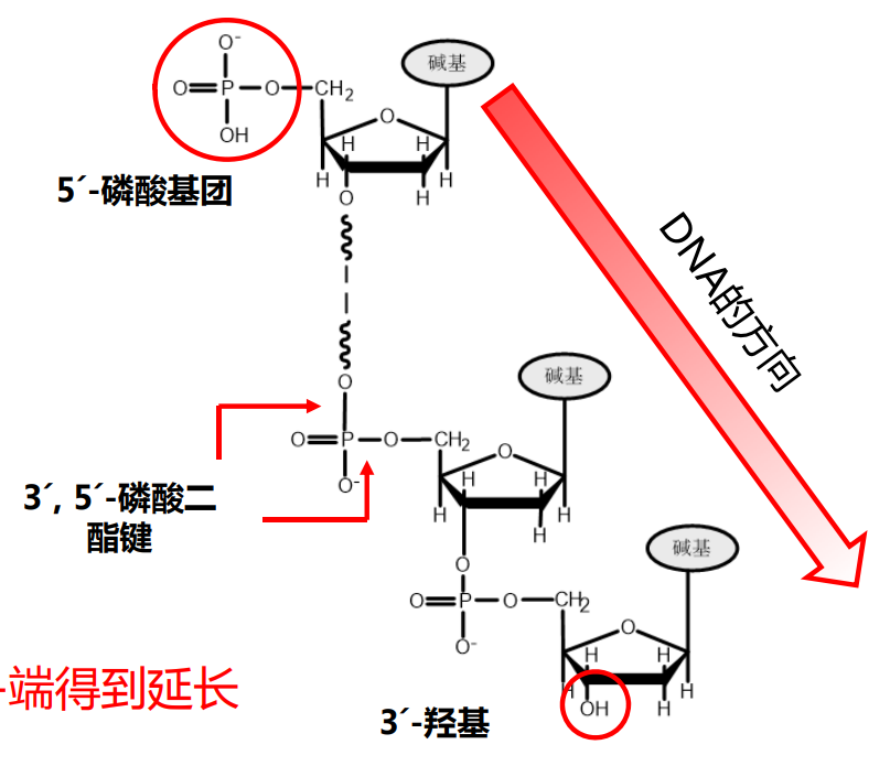 对于多聚核苷酸链来说,其具有方向性,后来者只能从3'-端延长链,也就是说 DNA/RNA 的正方向可以被定义为 5'-3'。