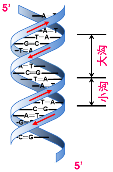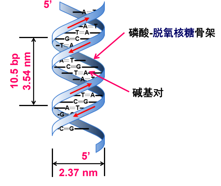 DNA由两条反平行的脱氧核糖核酸链组成,之间由碱基互补配对形成的氢键连接,亲水性骨架将互补碱基对包埋在DNA双螺旋内部,碱基对重叠产生碱基堆积作用,一个螺旋周期包含约10.5bp的碱基对,整个螺旋大多数时候为右手螺旋(Z型 DNA 为左手螺旋)。