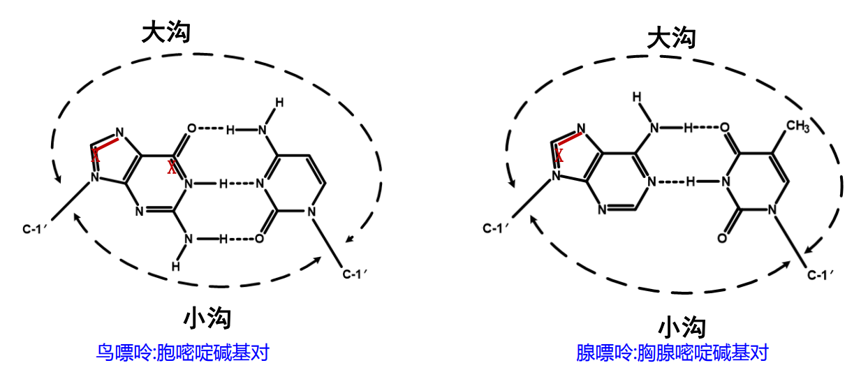 由于碱基的互补配对不是完全的正对,因此一对互补的核苷酸在糖苷键上形成了两侧大小不一的夹角,在双螺旋的结构中(特别是B型)形成了两面大小不一致的沟壑。