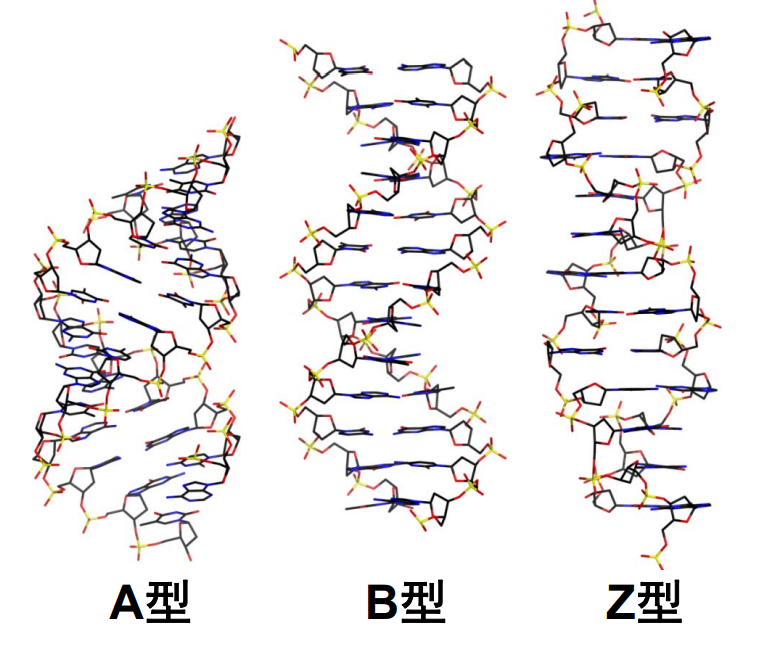 DNA螺旋具有多种不同的形式,常见的有以下三种: