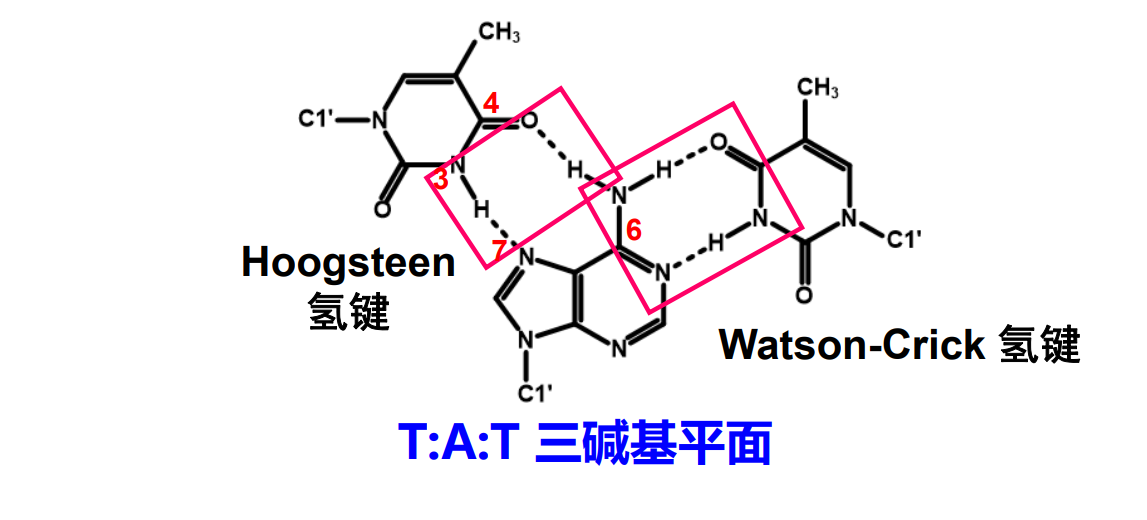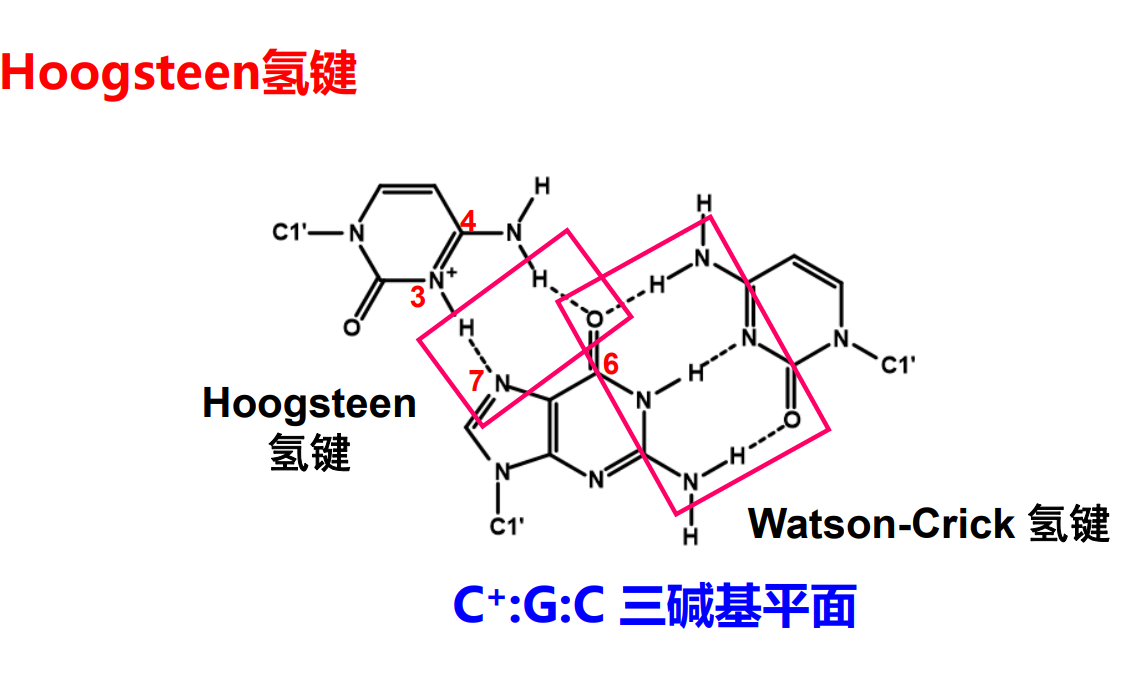 而基于氢键互补配对的理论,在GC对和AT对的碱基上仍保有形成氢键的潜力,所以自然而然可以猜想到可能存在的三链螺旋结构。