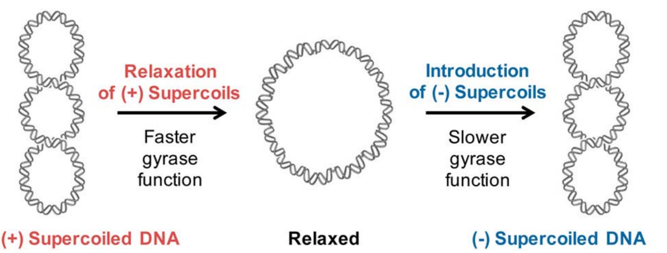 显然,与橡皮筋不同的是,DNA本身的二级结构具有螺旋方向上的取向,如果超螺旋的方向使得双螺旋缠绕更紧,称之为正超螺旋,如果使得双螺旋更加松散,则称之为负超螺旋。