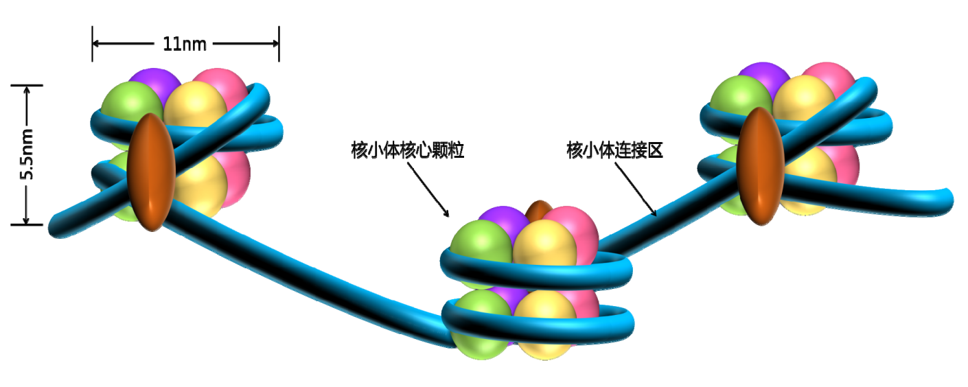 在细胞周期的大部分时间里,DNA以松散的染色质 (chromatin) 形式存在;在细胞分裂期,则形成高度致密的染色体 (chromosome),染色质的基本组成单位是核小体。