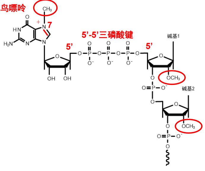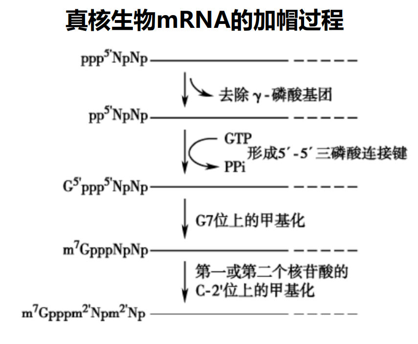 真核生物的mRNA有5'-端帽结构,具体来说,其在5'-端会有一个通过5'-5'三磷酸键连接的7-甲基鸟嘌呤核苷酸,同时第一个和第二个核苷酸的二号碳上的羟基亦可以发生甲基化,形成一个特殊的“帽子结构”。