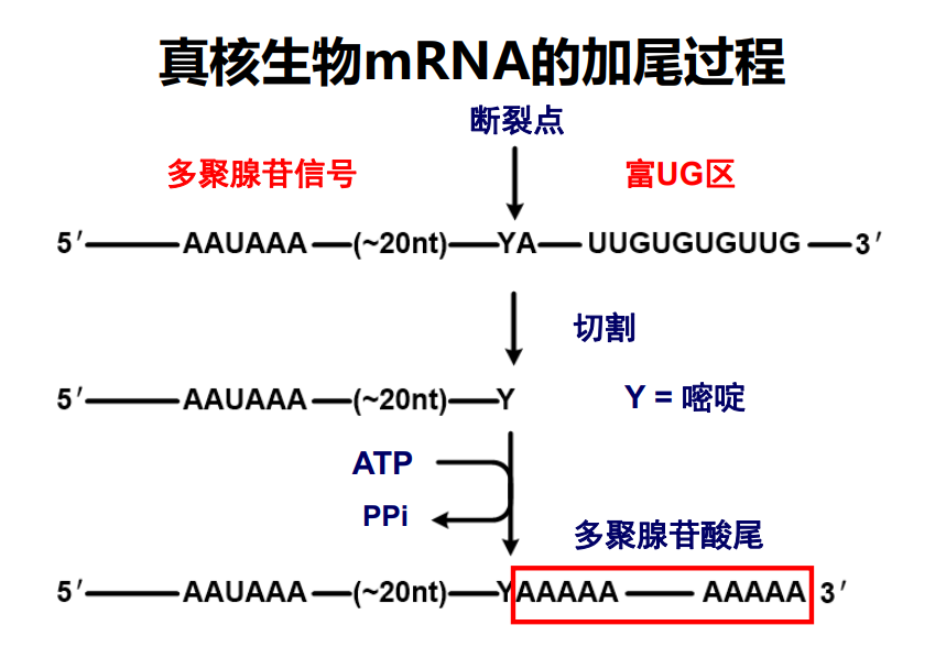 真核生物mRNA的3'-端有一段长度约为80-250腺苷酸,称为多聚腺苷酸尾,可以与poly(A)-结合蛋白 (PABP)结合,与CABP一起同负责mRNA从细胞核向细胞质的转运、维持mRNA的稳定性以及翻译起始的调控。