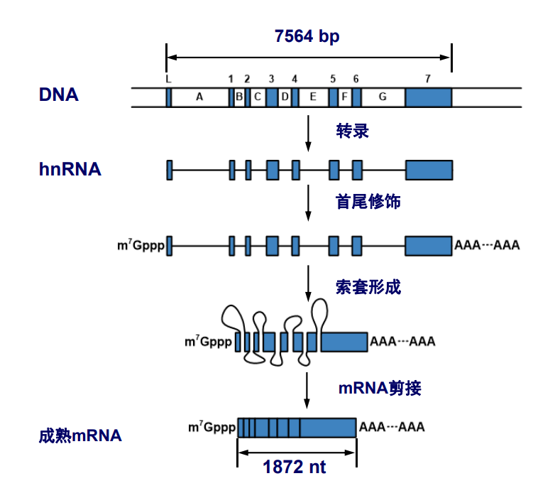 hnRNA经过剪接和加工过程,剔除内含子,连接外显子,成为成熟mRNA。
