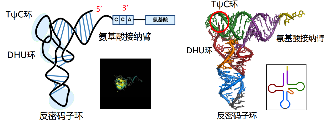 tRNA的各个结构拼在一起,在平面上长得像个三叶草,三片叶子分别对应DHU环、反密码子环和TψC环,叶梗对应氨基酸接纳臂。