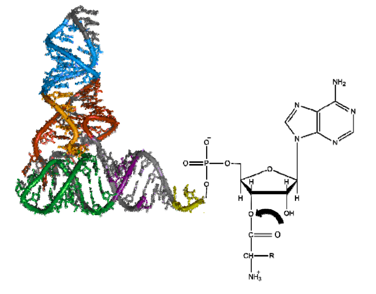 tRNA的3'-端负责与氨基酸相连,一种tRNA只能携带一种特定的氨基酸,但是一种氨基酸可以被多种tRNA携带(密码子简并性)。连接在tRNA上的氨基酸才可以用来进行蛋白质的生物合成。