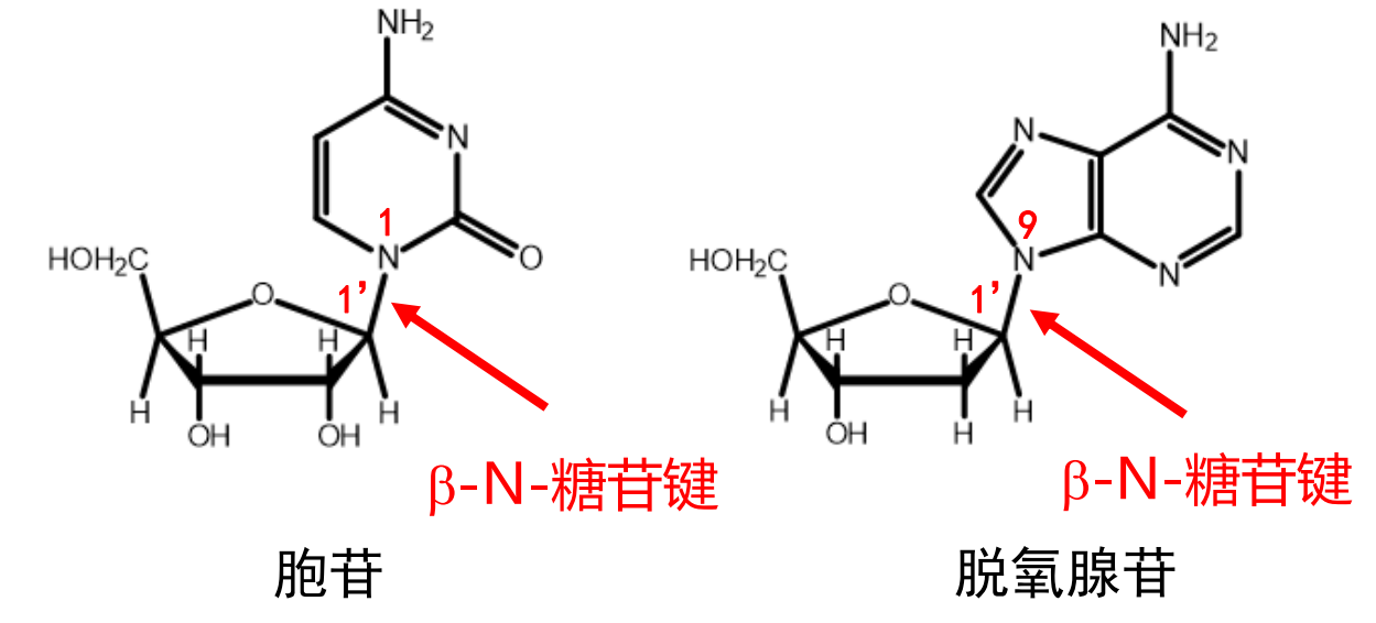 如果我们将碱基和核糖连接起来,就得到了核苷,碱基和核糖之间的化学键叫做\({\beta - N - 糖苷键}\)。