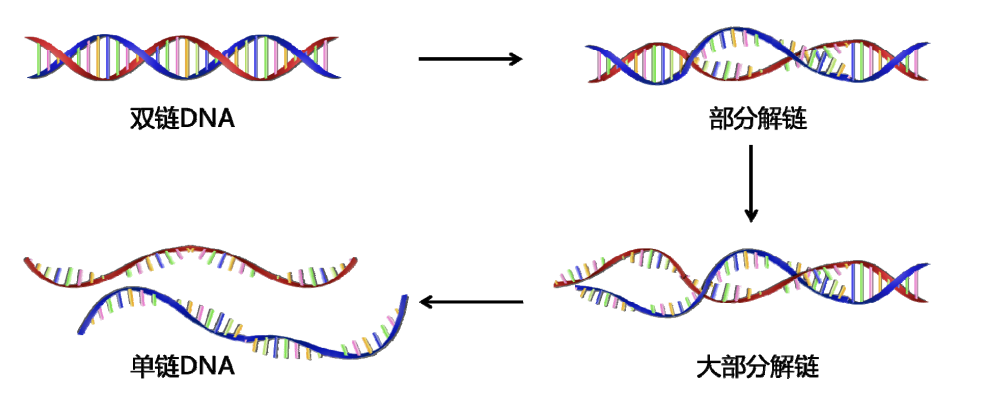 类似于蛋白质,在某些理化因素作用下, 双链DNA(double stranded DNA, 简称dsDNA)解离成为两条单链DNA(single stranded DNA, 简称ssDNA)的过程被称为DNA的变性。