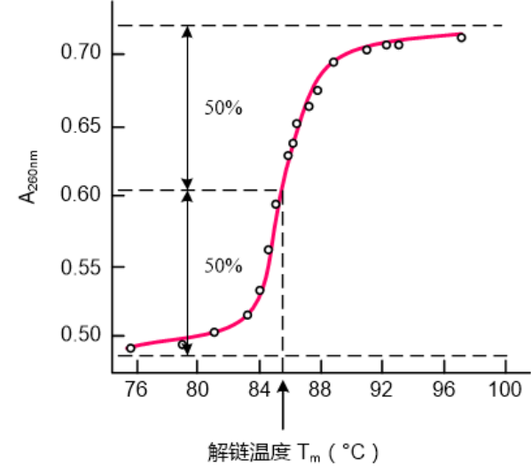 基于这样的性质,我们规定DNA的解链温度 Tm为DNA的解链过程中,紫外光吸收值达到最大变化值的50%时的温度,基于DNA对260nm的吸收程度不同,可以绘制DNA的解链曲线。