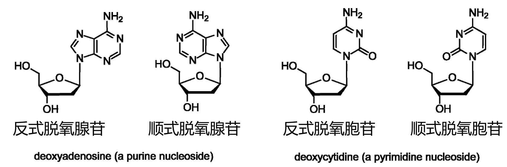 由于空间位阻的影响,碱基和戊糖环就着糖苷键形成反式构象。