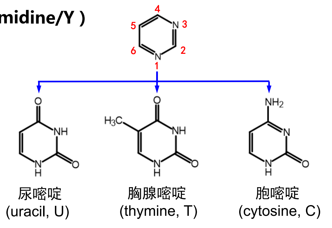 体内的嘧啶碱基有三种:尿嘧啶、胸腺嘧啶和胞嘧啶。