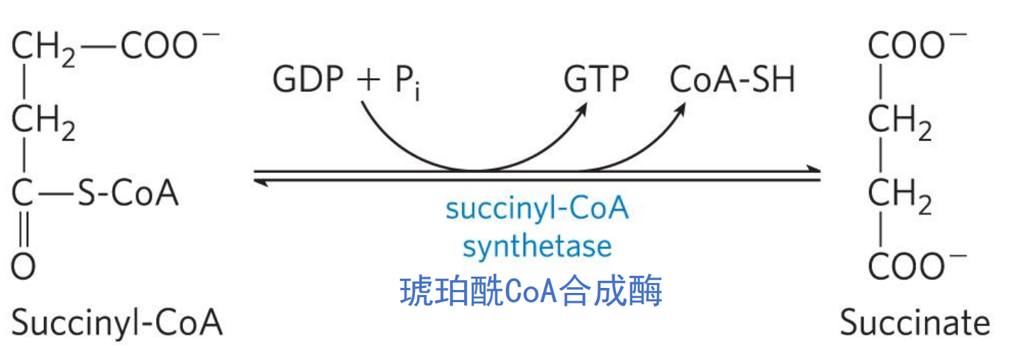 琥珀酰CoA合成酶由两种同工酶,均催化琥珀酰CoA水解生成琥珀酸,但是高能硫酯键能量去向不同,一个走向ATP,一个走向GTP.