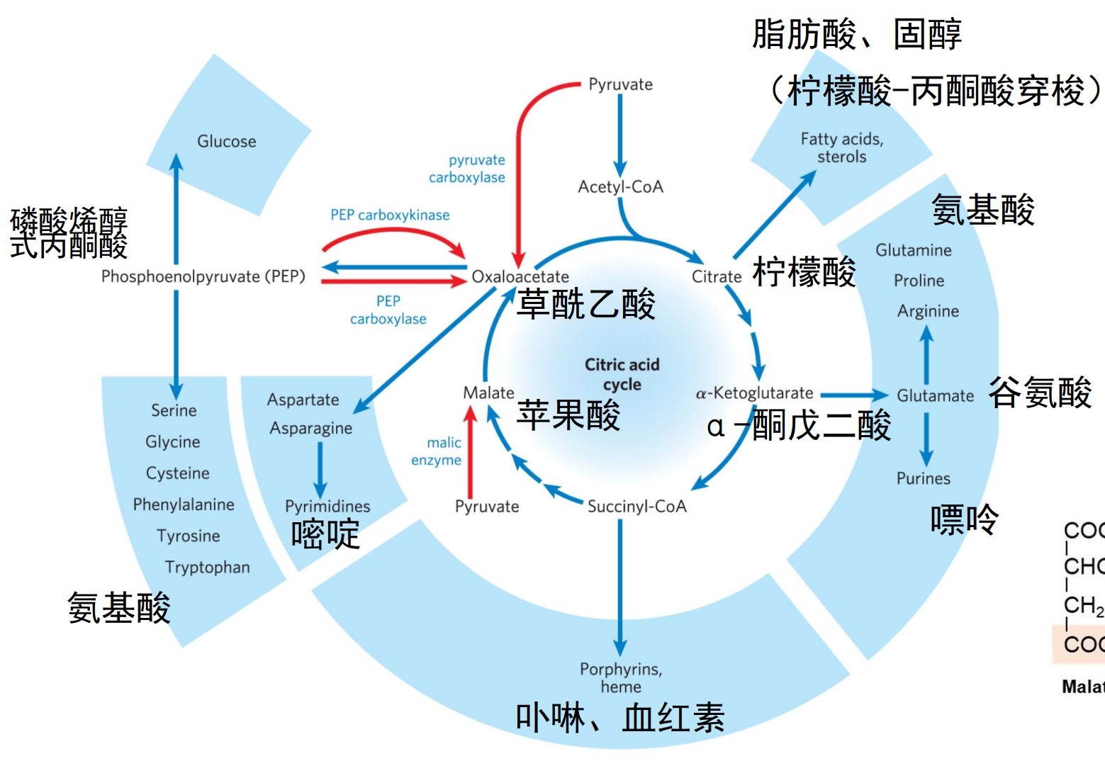 下图展示了三羧酸羧酸循环中的重要代谢前提物质: