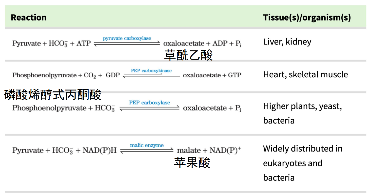 - 草酰乙酸是嘧啶的前体,可以转化为磷酸烯醇式丙酮酸 (PEP),再合成为许多非必需氨基酸与葡萄糖。