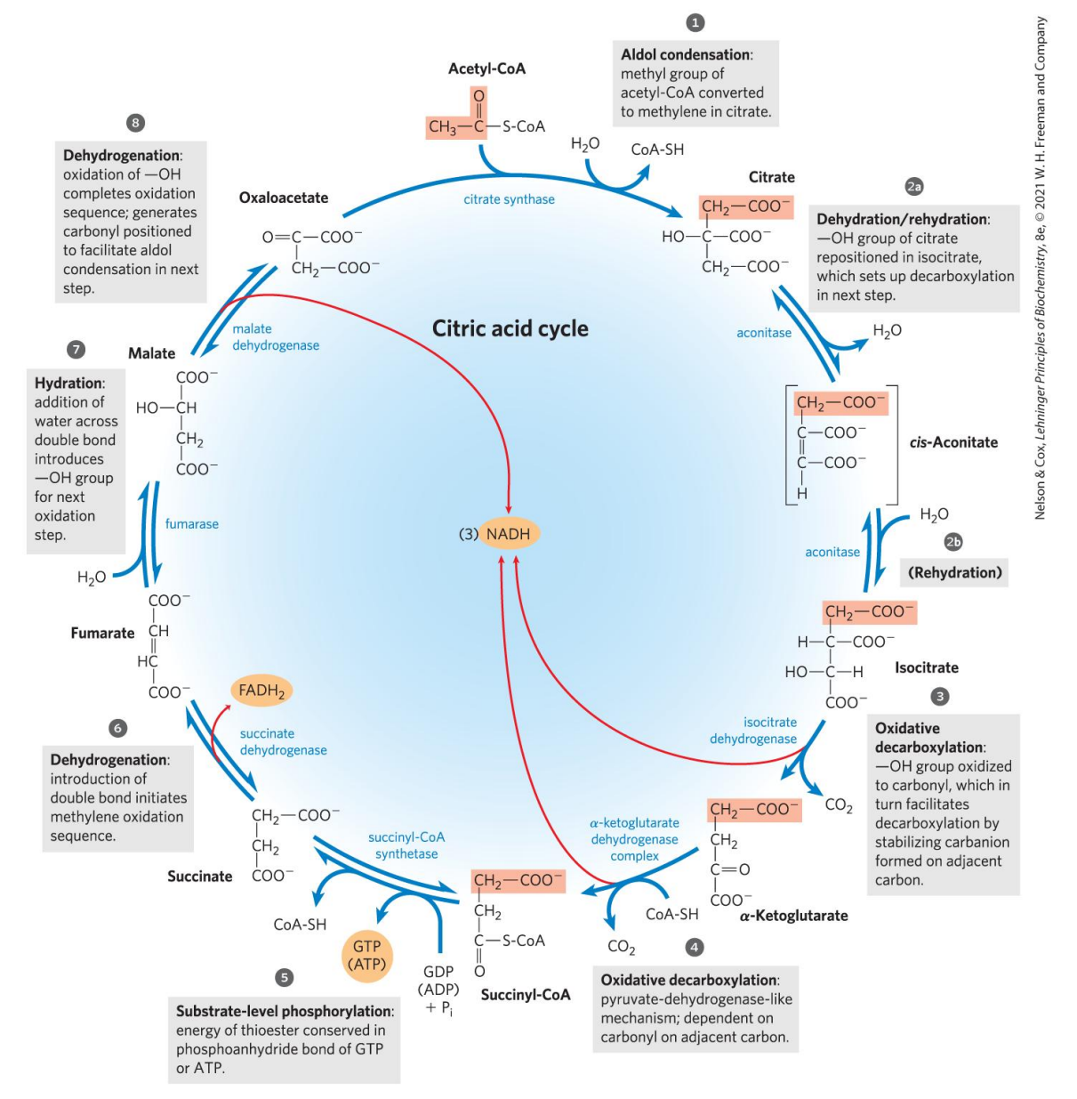 - 乙酰CoA电子转移生成三分子\(\ce{NADH}\)和一分子\(\ce{FADH2}\)