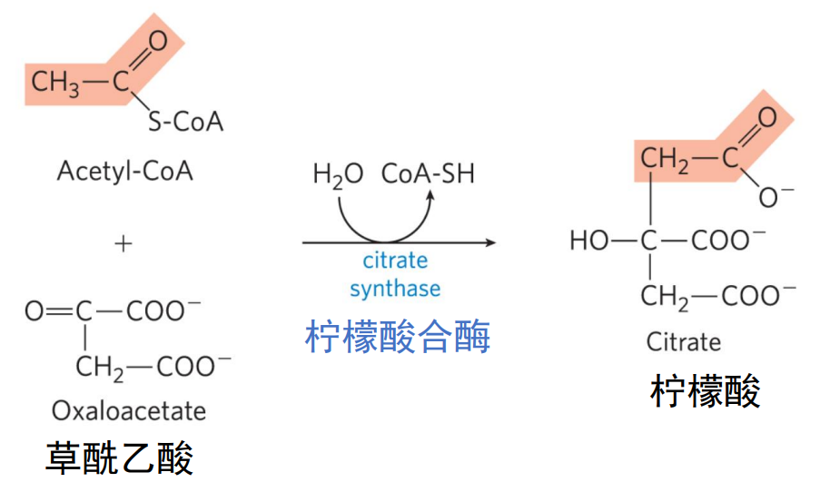 柠檬酸合酶的催化下,乙酰CoA上的甲基碳作为亲核试剂进攻草酰乙酸α-酮基上缺电子的羰基碳,形成柠檬酰CoA中间体。