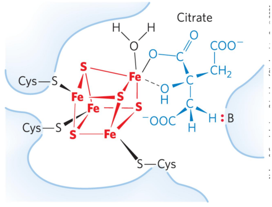 乌头酸酶通过铁硫中心催化反应进行,其是常见的电子载体辅基(复合物\(\rm{I-III_2}\))。