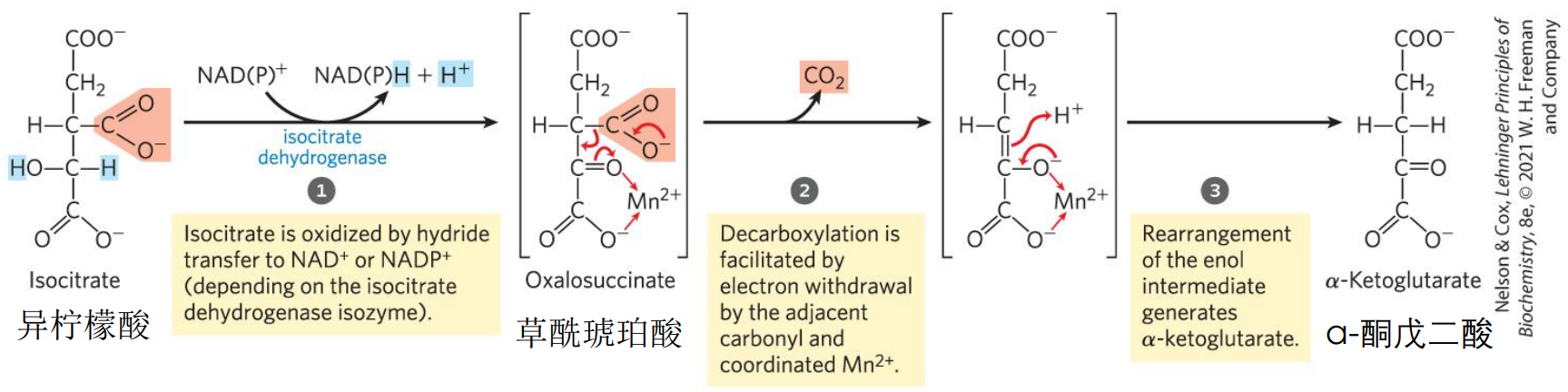 异柠檬酸脱氢酶催化六碳的异柠檬酸脱羧生成五碳的α-酮戊二酸,给出两个电子,\(\ce{NAD+}\)或\(\ce{NADP+}\)作为电子载体接受电子。