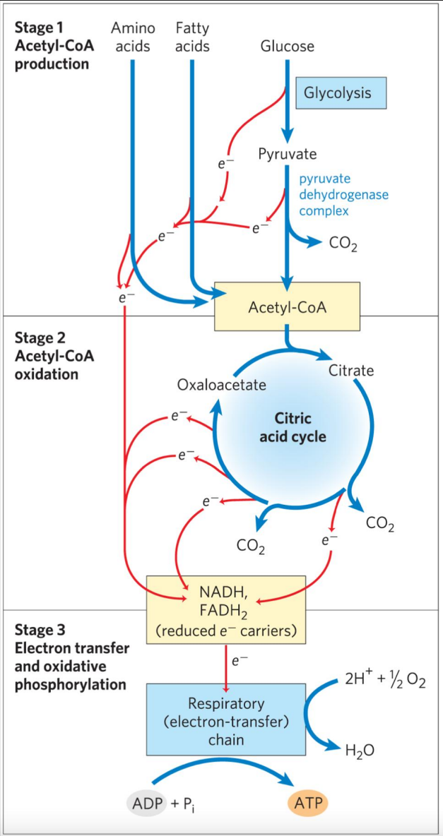 三大营养物质——糖、脂肪与部分氨基酸氧化生成乙酰CoA,再通过三羧酸循环氧化乙酰基团并提取出电子,在通过电子传递链最终还原氧气,偶联合成ATP。